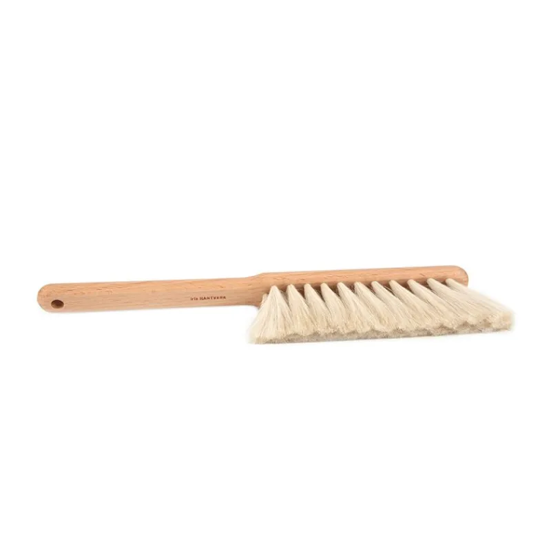Dammborste i oljad bok och gethår. Borsten är mjukt och följsam materialet binder dammet så att det inte yr runt. Gethåret blir inte statiskt så det är en utmärkt borste att använda för rengöring av tv eller dataskärmar. Gethår skall inte blötas för då tovar det ihop sig och förlorar sina bra egenskaper. Du rengör din borste genom att dra handen över den och skaka ur den eller att dammsuga den försiktigt.