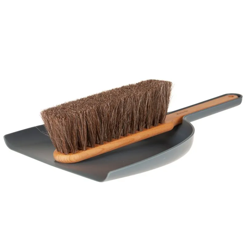 Kort sopset med borste i tagel och oljad bok med praktiskt handskyffel i petroliumblå bio-polyeten. Utmärkt för att sopa upp lite grövre skräp och grus från bänkar och bord inomhus och utomhus.