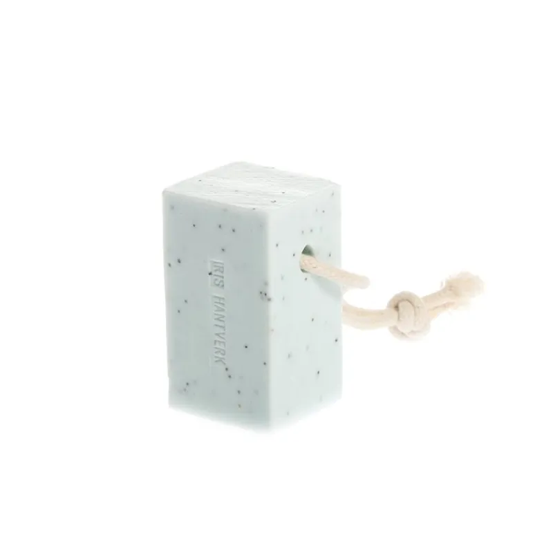 Mild krämig tvål med vallmoskrubb. Doftsatt med äkta eterisk olja, grönmynta. Praktisk att hänga upp i duschen.
