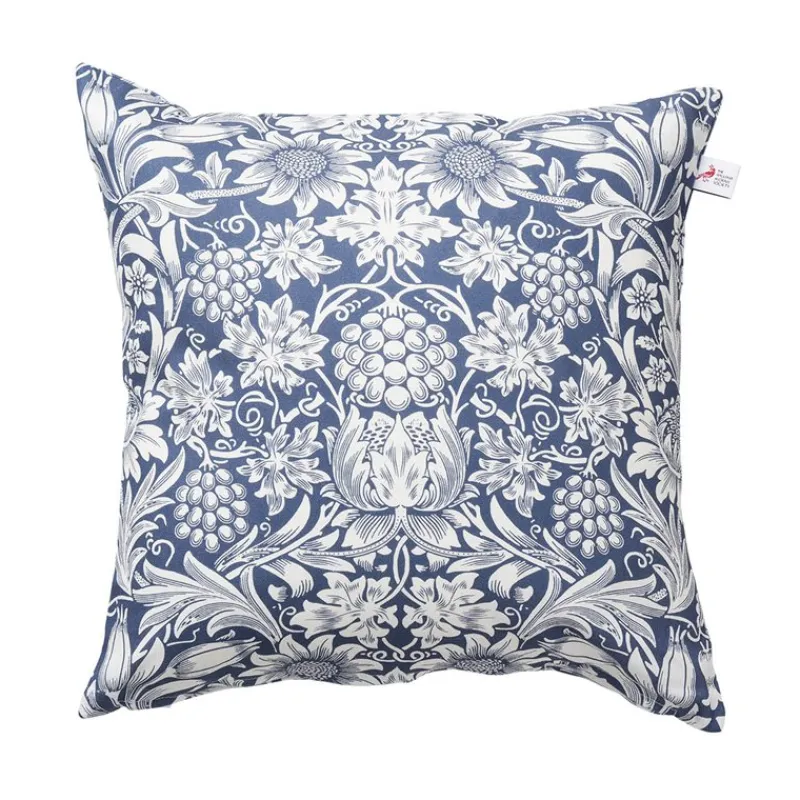 Kuddfodralet Sunflower design av William Morris produceras av Oeko-Tex certifierade mönstertryckare med mångårig kunskap om sitt hantverk. Ett klassiskt mönster i en vacker mörkblå färg som passar i hemmets alla rum.