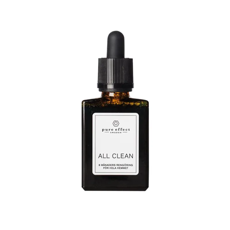 Fyll på ditt All Clean Start Kit med denna refill. Den räcker för tillblandning av 20 stycken sprayflaskor à 300 ml. Den unika formulan baseras på en aktiv bakteriekultur som effektivt bryter ner fett, smuts och lukt. All Clean används till alla ytor som tål vatten – toalett, fönster, speglar, rostfritt, keramik, köksbänkar, fläckborttagning på textil med mera.