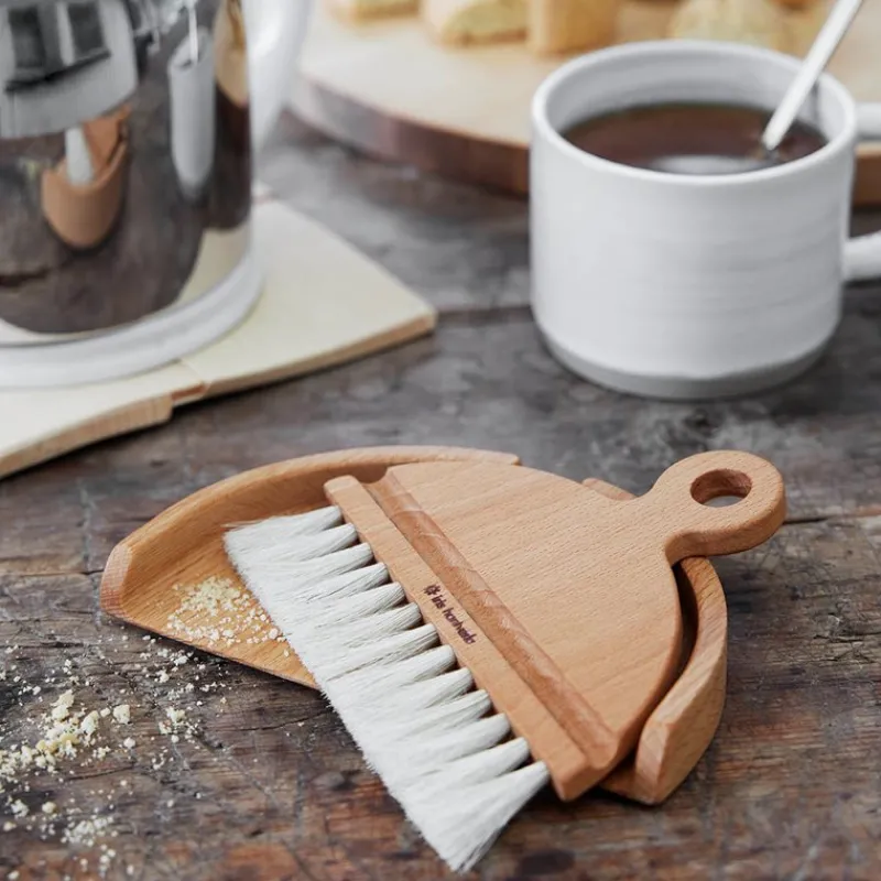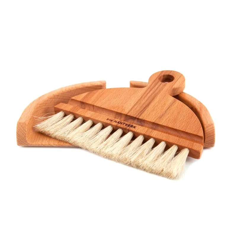 Få bort smulorna från bordet i ett nafs med denna lilla borste och skyffel. Vackert och praktiskt bordsborstset i oljad bok med borst av tagel, handdragen.