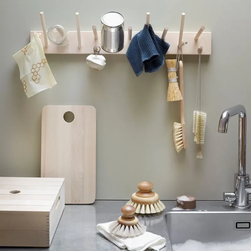 Multihängare i obehandlad björk. Hängaren är framtagen för att hålla ordning på alla ursköljda engångsförpackningar på sin väg till återvinningen. Men den fungerar också alldeles utmärkt som hängare i sovrum, hall, badrum eller varför inte i växthuset för redskap. Eftersom den är obehandlad kan man olja, måla eller vaxa den.