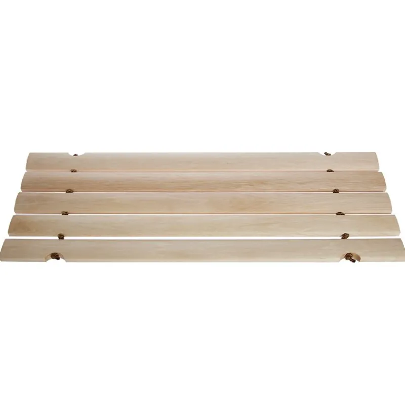 Smart förvaring för badborsten och tvålen, placeras tillgängligt på badkarskanten. Handknutna ribbor i oljad björk och tråd i clipper. Clipper är ett tåligt vattenbeständig rep som oftast används till båtar.