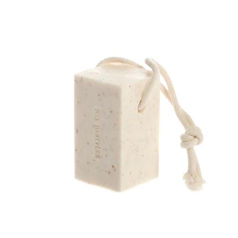 Mild krämig tvål med mandelolja och vetekli. Tvålen är doftsatt med äkta eteriska oljor av kardemumma och vanilj. Praktisk att hänga upp i duschen.