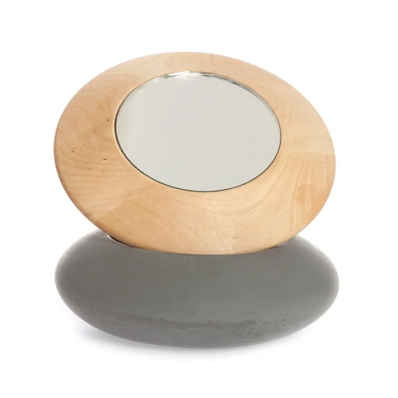 Spegel i oljad björk. Spegeln kan dels sättas upp och ner som ett lock. Då blir undersidan på spegeln som en liten skål för förvaring av smycken, hårnålar etc. Eller så lutar man spegeln stående.
